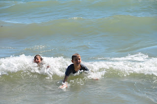 Here's Aidan with cousins Dexter and Justin, hanging out on the blue raft.